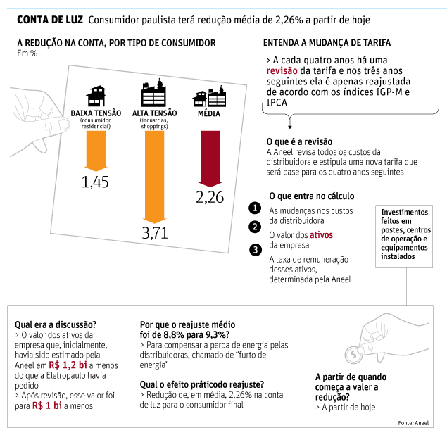 A redução média, de 2,26%, considera também consumidores de média e alta tensão, como shoppings e indústrias, que são grandes consumidores de eletricidade.