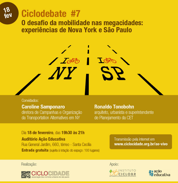 Como aliar o crescente desejo pela transformação da mobilidade urbana às decisões e processos da administração pública? Como estimular e garantir a participação social necessária? Quais são os diálogos possíveis entre as experiências e perspectivas das duas cidades? Quais ações e projetos estratégicos colocaram Nova York entre as cidades do mundo que mais têm feito para estimular a mobilidade por bicicletas, à pé ou de transporte público? Quais são as perspectivas para a mobilidade em São Paulo?