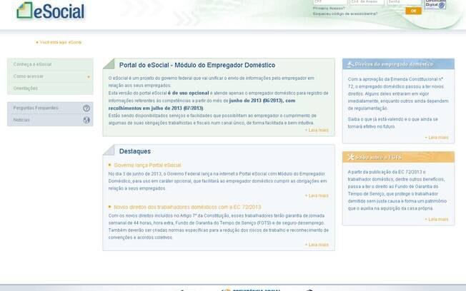 O governo federal lançou nesta segunda-feira (3) o portal para os empregadores domésticos ( www.esocial.gov.br ), que promete ajudar no cálculo de horas extras e de contribuição previdenciária. O site ainda é uma versão inicial, de uso opcional.A plataforma será alterada quando sair a regulamentação da emenda constitucional que trata dos direitos dos trabalhadores domésticos.