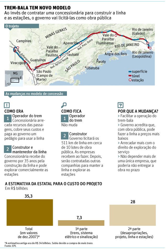 Essa lógica é completamente oposta à que o governo apresentava até 2011, quando tentou leiloar o trem-bala sem sucesso.