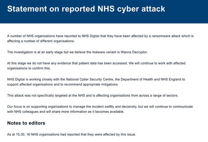 Por conta do ataque, pacientes precisaram ser transferidos para outras instituições, e diversas consultas, exames e operações precisaram ser cancelados. Os funcionários foram orientados a desligar todos os computadores e, em alguns casos, desconectar todos os cabos de rede, e aguardar futuras instruções. Todas as atividades não-urgentes foram adiadas. O NHS emitiu um comunicado sobre a situação, que pode ser lido abaixo: